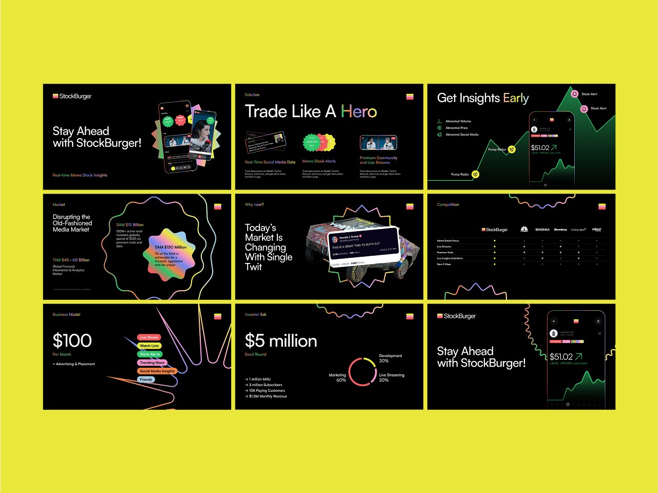 The pitch deck hits hard with attitude and clarity — walking investors through the market gap, monetization layers, and community-first growth strategy. The app is built for scrollable joy and fast dopamine: swipe trades, meme feeds, and customizable burger-styled portfolios. The website lands the concept instantly — bright, irreverent, and conversion-ready. StockBurger isn’t just an app — it’s a brand you can taste. The client called it “a Big Mac of ideas.” We’re loving it.